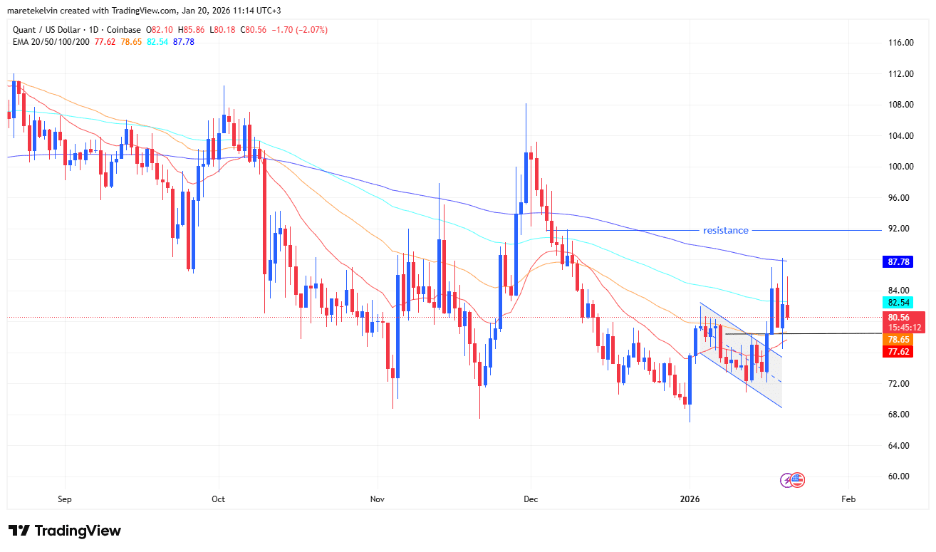 Quant [QNT] 的日线图显示,自其价格在五天前于 78 美元填补市场不平衡后突破看涨三角旗形盘整形态以来,其价格已大幅上涨。