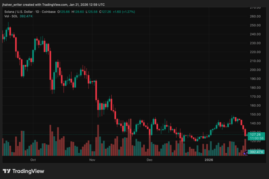 尽管SKR将人们的注意力集中在Solana的移动战略上,但SOL代币SOL本身正面临技术考验。跌破136美元后,SOL已下滑至120-127美元区间,该区域内一条自2023年低点以来的上升趋势线与历史水平支撑位相交。