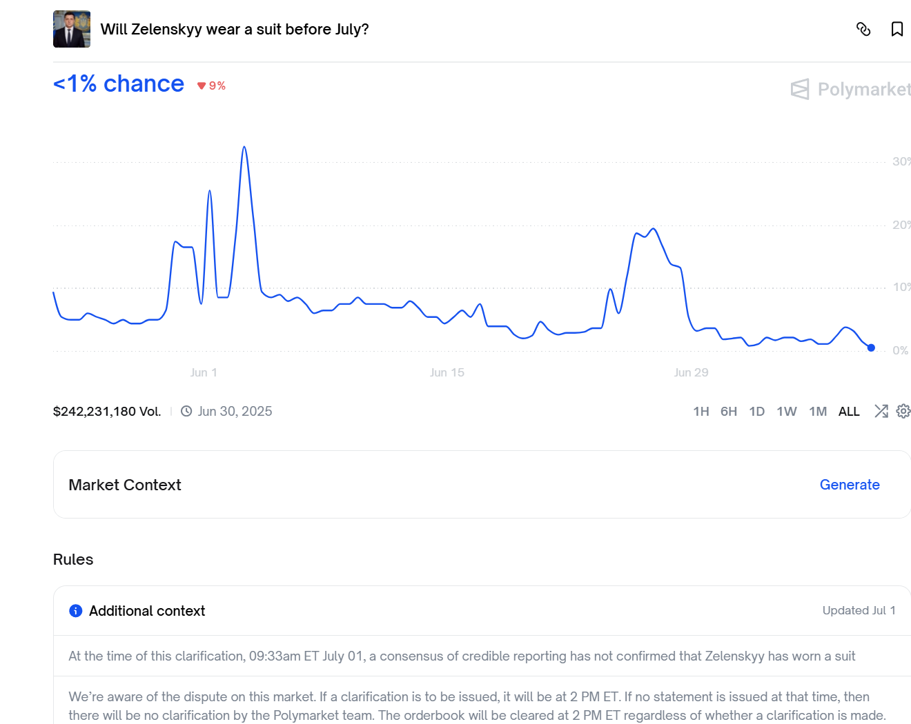 现实中,去年 6 月泽连斯基身着正式西装出席公开活动,BBC 及设计师等多方解读均认定其为西装,按常理判断,结果本应尘埃落定,但在 Polymarket 上,这一看似清晰的事实却演变为一场涉及数亿美元资金的拉锯战。