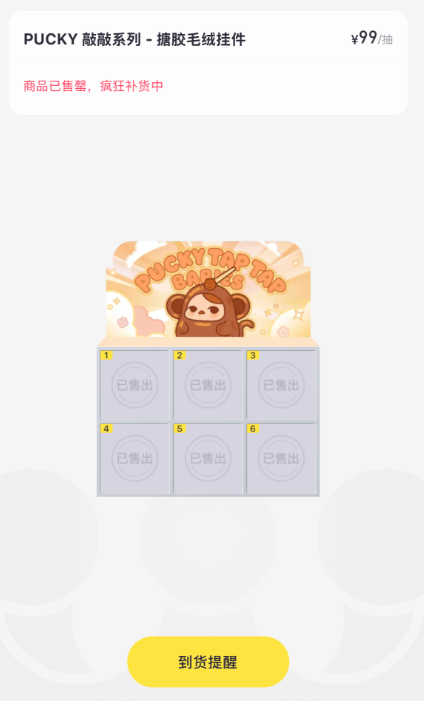 泡泡玛特官网显示的"PUCKY敲敲系列"为搪胶毛绒挂件,采用6款常规角色加1款隐藏款的经典盲盒配置。单盒售价99元,整盒6个售价594元。截至22日,该系列在官网已显示售罄。