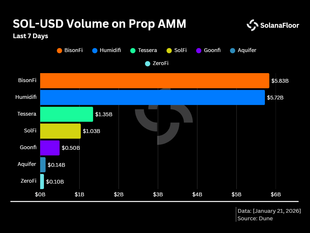 从更短的时间框架来看,Prop AMM 的应用规模更加显著。仅在过去七天内,BisonFi 和 HumidiFi 两家平台通过 $SOL-$USD 货币对的交易量合计超过 115 亿美元,巩固了它们作为 Solana 平台上两大 Prop AMM 平台的地位。Tessera 和 SolFi 紧随其后,周交易量分别为 13.5 亿美元和 10.3 亿美元。