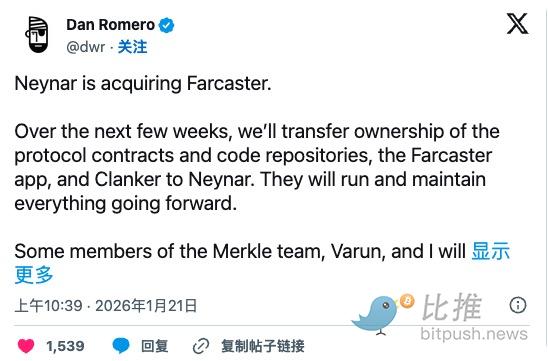 就在 Lens 消息传出的第二天,Farcaster 联合创始人Dan Romero宣布, Farcaster 基础设施提供商 Neynar 正在收购 Farcaster 的应用、协议以及 Clanker 技术栈。Farcaster 的初创领导团队将不再加入新公司,但 Neynar 表示,他们将致力于把该项目重塑为一个“开发者优先”的社交网络。