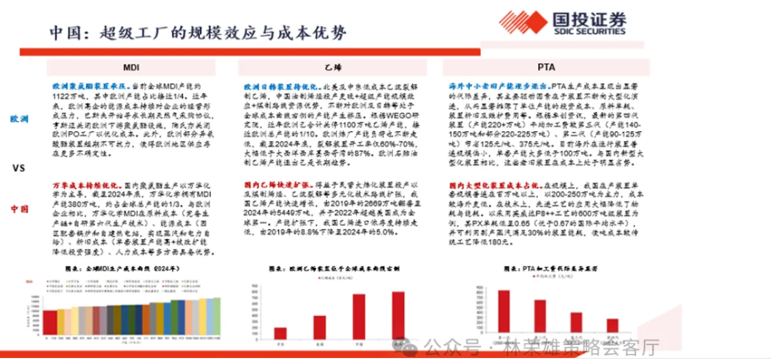 彭京涛:首先第一个问题聚焦于和化工领域的出海竞争力层面,我们关注到近年欧洲化工产能利用率降至74.6%的低位,累计关停1100万吨乙烯产能,而中国86类重点化工产品中40%出口量创近六年峰值,中上游产品加速抢占全球份额。本轮化工出海突围的核心是欧洲能源/环保压力下的产能退出,还是中国“超级工厂”的规模效应+技术迭代形成的成本护城河?