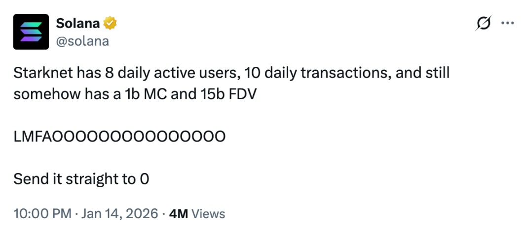 近日,Solana 开了个 Starknet 的玩笑,吐槽一个只有 8 个日活用户,每天 10 笔交易的 L2 居然还有 150 亿美元的 FDV。