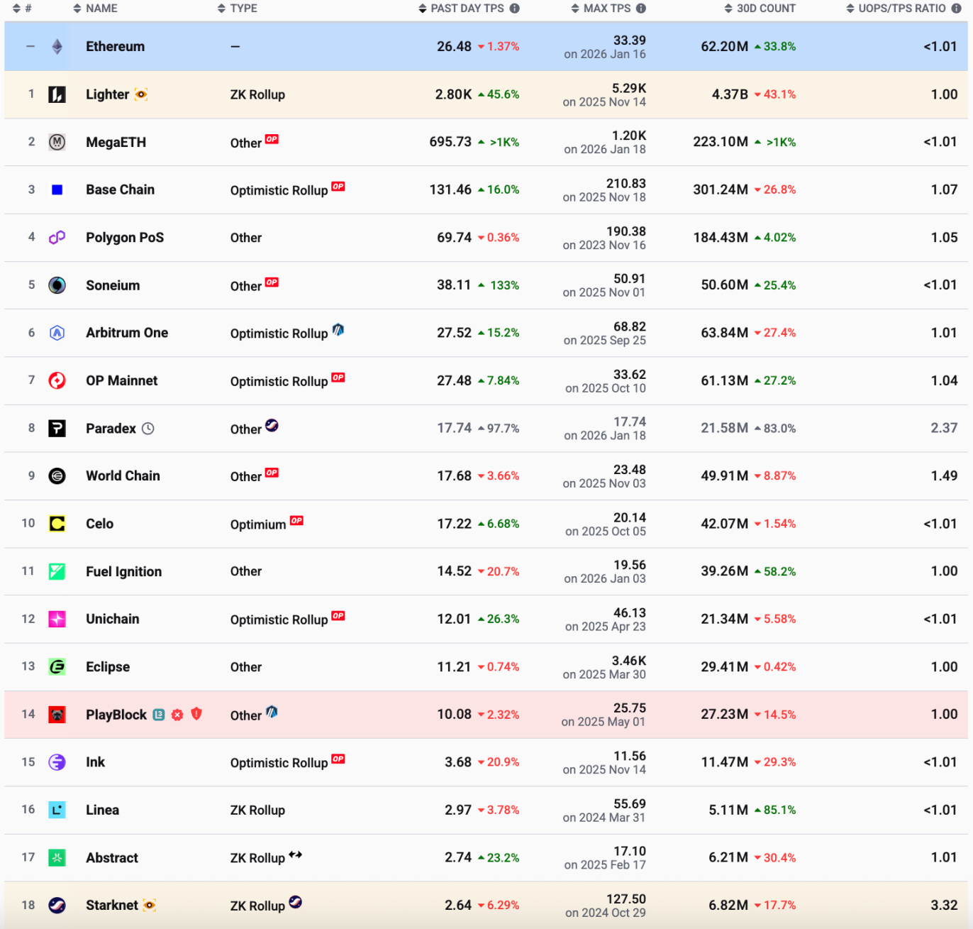 数据显示,通用 L2 中除了 Base、Polygon 之外,甚至 Arbitrum 和 OP Mainet 的 TPS 都没有大幅超过以太坊。Linea、Starknet 的 TPS 不到 3,截图没有截到的部分还包括了 TPS 略超 1 的 Scroll 以及不到 1 的 ZKsync、Blast 等。