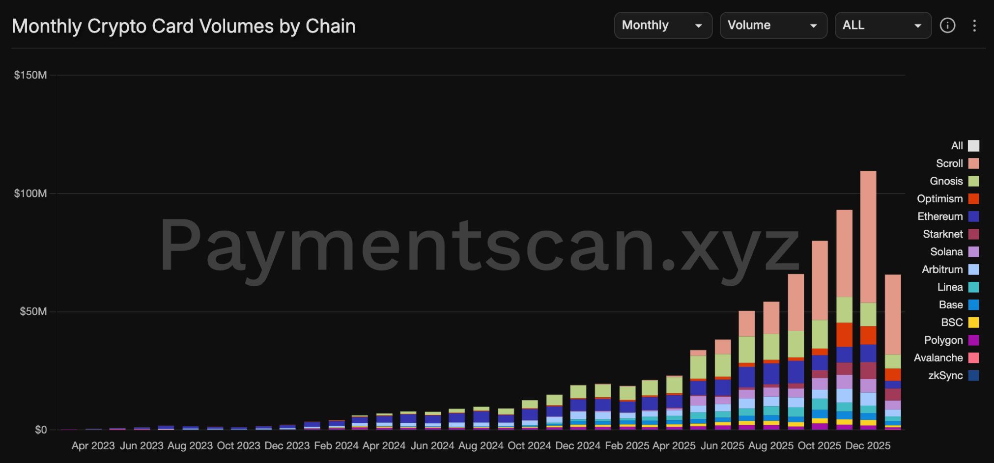 当前很多交易所推出的加密货币卡是一种「托管式」卡,用户的资产存在交易所或者机构托管账户中,消费时由交易所和 off-ramp 公司及发卡方进行结算。而此类卡的结算链通常为 Tron 或者 Solana 甚至是成本略高的以太坊,一方面是这些链上的稳定币资产存量足够大,另一方面,有些卡通过批量结算而非逐笔结算降低了成本。对于机构而言,流动性和稳定性可能比 L2 的低成本更重要。