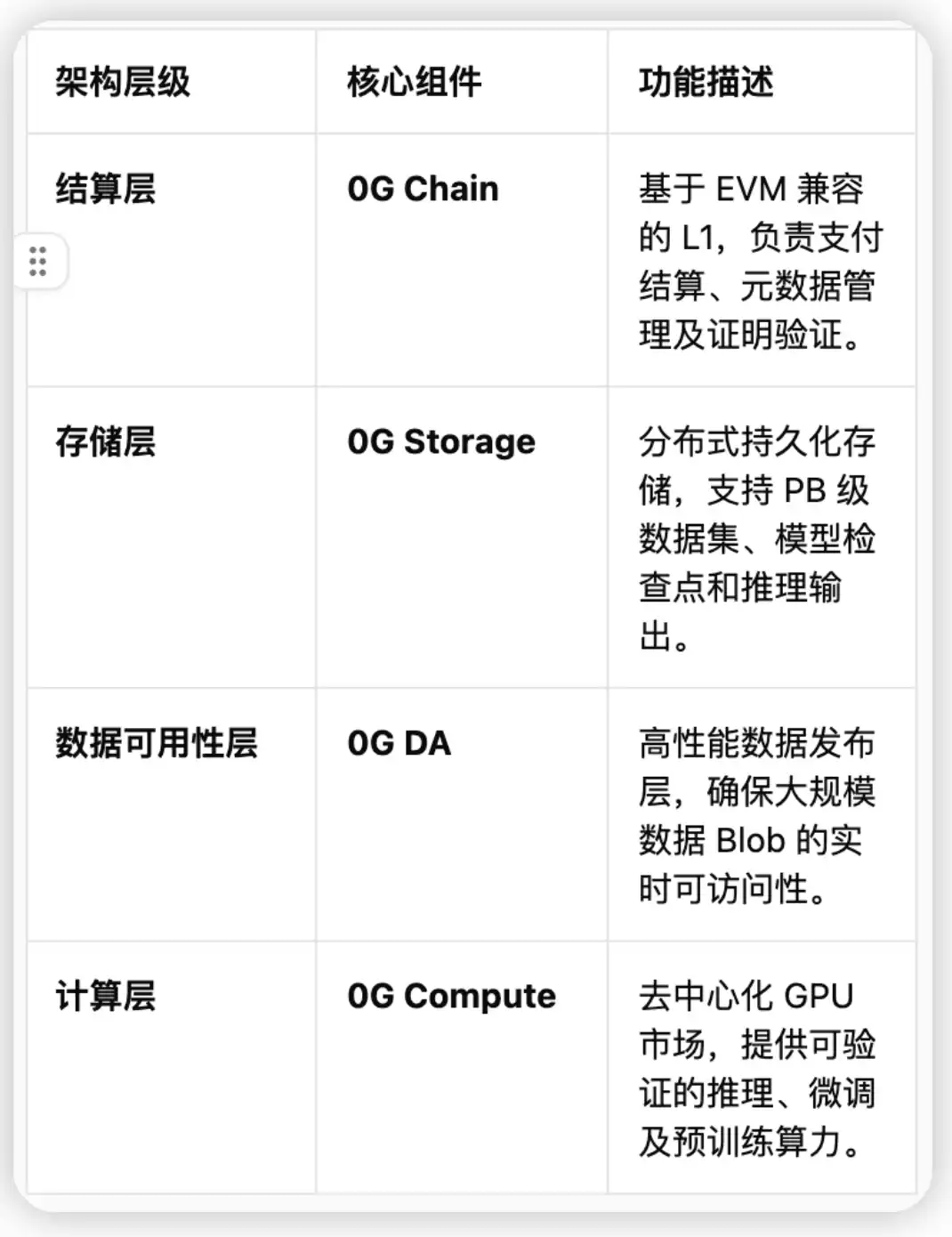 0G 并非简单的单一区块链,而是被定义为 dAIOS (去中心化 AI 操作系统)。这一概念的核心在于,它为 AI 开发者提供了一个类似操作系统的完整协议栈,通过四层架构的深度协同,实现了性能的指数级跃升。