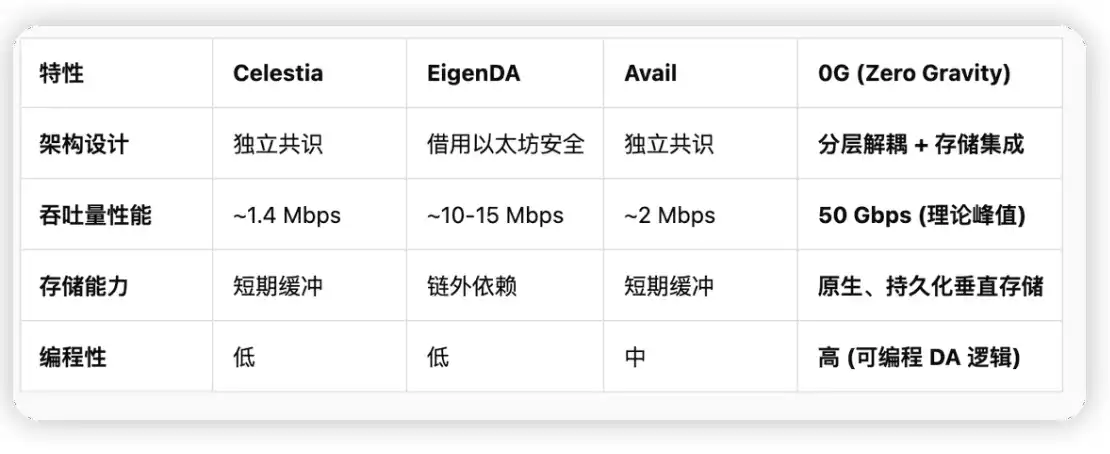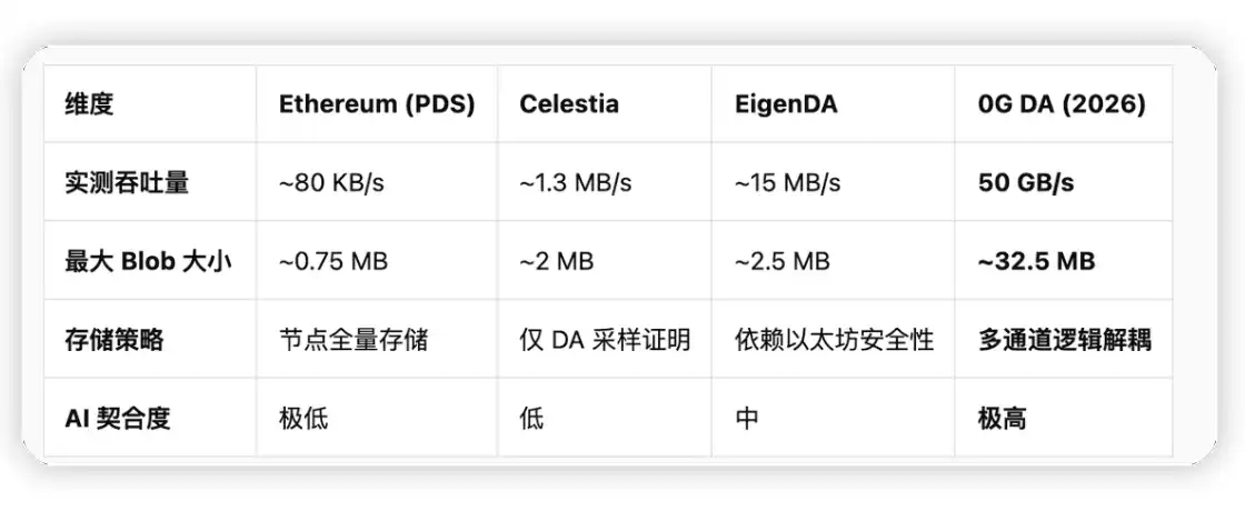 0G DA 在吞吐量上的突破,直接定义了去中心化 AI 操作系统的性能边界。下表展示了 0G 与主流 DA 方案的技术参数对比: