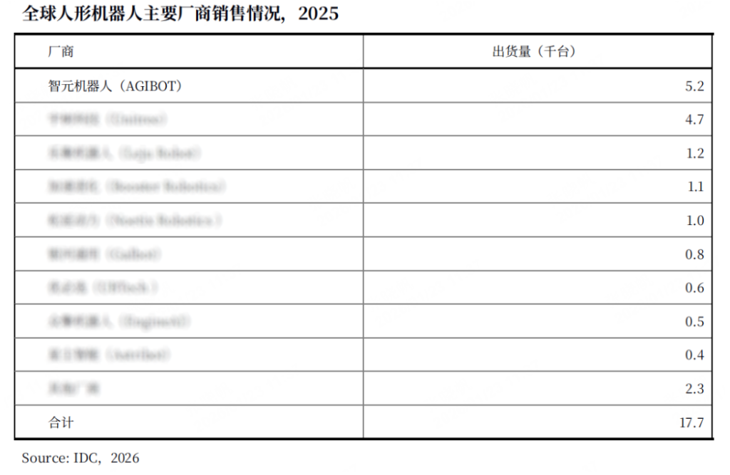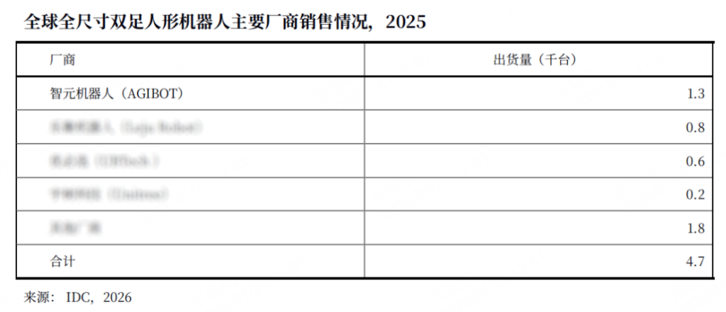 根据IDC于2026年1月23日发布的《全球人形机器人市场分析》报告,2025年全球人形机器人出货量约1.8万台,同比增长约508%,中国厂商在规模化商用进程中占据主导地位。智元不仅拿下全球整体出货量第一,还斩获全尺寸细分领域出货量第一,市场份额显著领先。