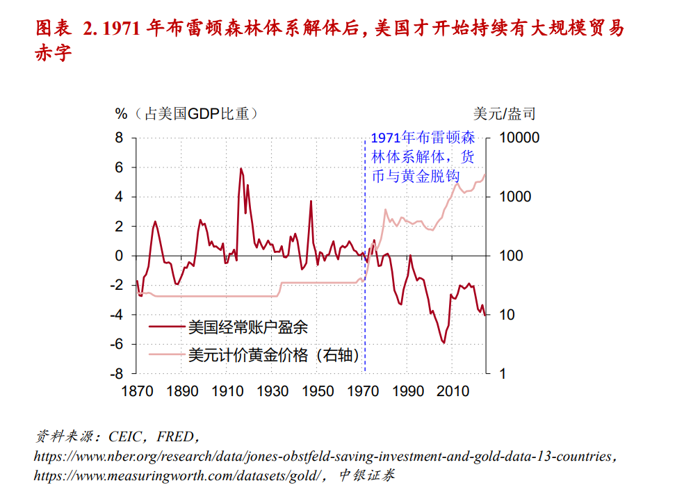 尽管全球失衡已持续了超过40年,但在人类经济社会发展的历史中,这种局面只是一种“新生事物”。在1971年“布雷顿森林体系”(Bretton Woods System)解体,美元与黄金脱钩之前,美国并没有长期持续的贸易逆差。而且不仅美国没有,其他国家也没有。从时间上来看,布雷顿森林体系解体后,以美元计价的黄金价格的持续大幅上涨,与美国贸易逆差的出现和持续有明显的同时性,而这并非偶然。正是1971年美元与黄金的脱钩,让世界经济进入了“法币体系”(Fiat Money System)时代,才让全球失衡变得可能。甚至可以说,在全球失衡与美元全球大循环这二者之间,后者是国,前者是果——美元全球大循环催生了全球失衡。要理解这一点,必须要对国际货币体系的演进做一些回顾。
