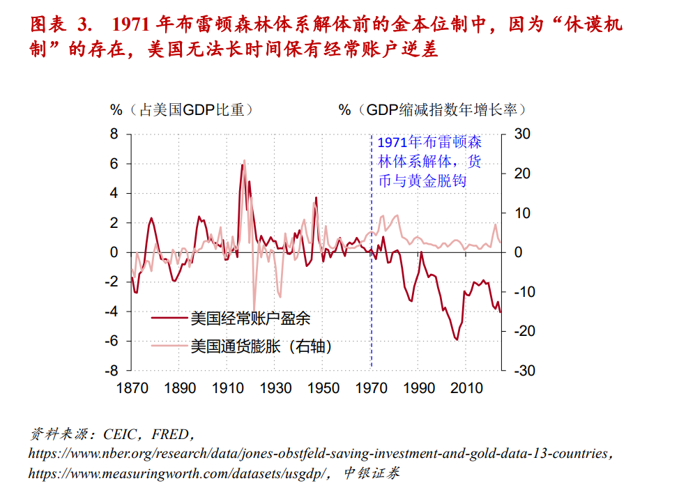 在美国经济的长周期历史数据中,能够看到“休谟机制”发挥作用的清晰证据。在1971年布雷顿森林体系解体之前的100年时间里,美国国内的通账率与美国的经常账户顺差(更广义的贸易顺差)间存在显著的正相关关系:美国经常账户顺差比较大的时候,国内的物价就涨得比较快;经常账户逆差的时候,国内物价就会涨得比较慢,甚至负增长。这种国内物价因贸易顺差变化而变化的“休谟机制”的存在,是美国在1971年之前无法持续保有贸易逆差的主要原因。但在1971年美元与黄金脱钩之后,美元的发行数量不再受到美国拥有黄金数量的限制。美国可以任意创造美元,也就不会因为贸易逆差而让国内陷入通货紧缩。1971年以来,美国长时间保有大规模贸易逆差,国内物价却一直正增长,甚至还出现过高通胀时期。这正是“休谟机制”失效的表现。由于“休谟机制”不再发挥作用,美国从而可能长时间有贸易逆差,全球失衡才可能出现。