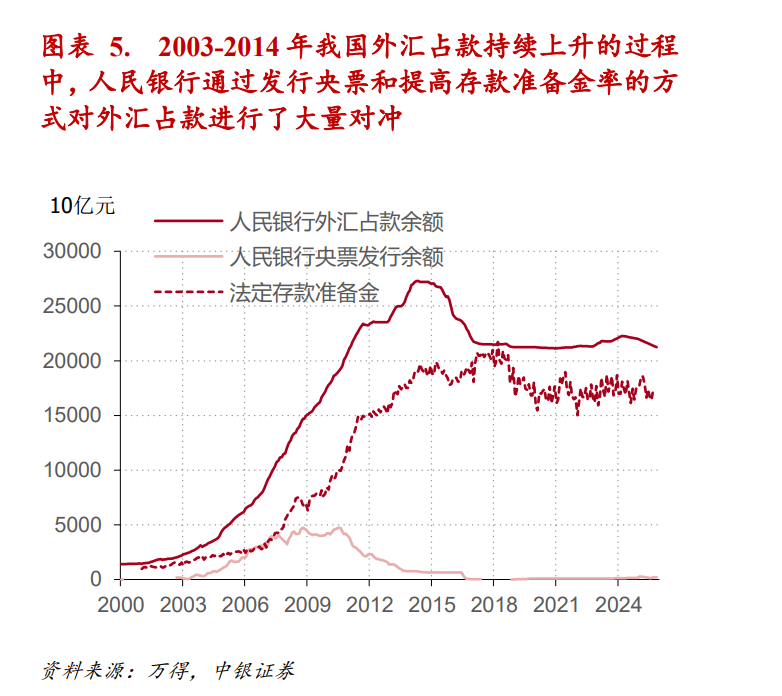 原因之二,在当前“牙买加体系”中,贸易顺差国可以通过“冲销操作”(sterilization)来规避“休误机制”的调整压力。即使是在牙买加体系中,顺差国也会因为贸易顺差而赚到国际支付工具(主要是美元)。顺差国中赚到美元的企业和居民如果把美元换成本币,会带来国内货币供给的扩张和通货膨胀。顺差国央行国民间结汇(把外汇换成本国货币)而被动释放的本国货币,就是所谓的“外汇占款”。在2003年到2014年间,我国曾因为大量的贸易顺差,导致人民银行发行超过20万亿元的外汇占款。不过,顺差国央行有办法把这些发放出去的外汇占款给回笼回来,从而避免国内通货膨胀。还是在2003- 2014年间,我国人民银行先是通过发行中央银行票据(央票)来置换商业银行手中的外汇占款,后来又是通过持续提升存款准备金率,将商业银行手中外汇占款锁定起来。通过发行央票和提升存款准备金率这两种冲销操作,人民银行在我国因贸易顺差而外汇大量流入的时候,对冲了外汇占款的发放,保证了国内通胀的稳定。