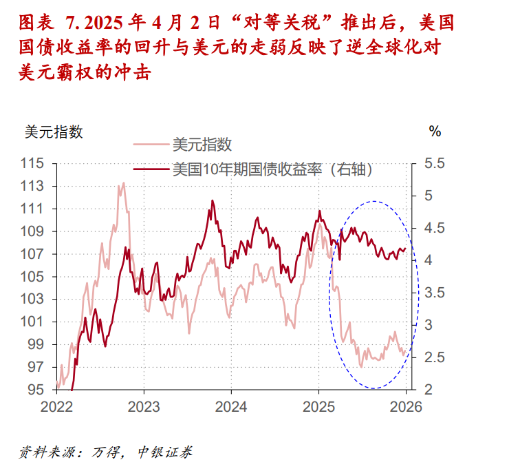 研究国际金融市场对“对等关税”政策的反应,可以帮助我们理解这一点。2025年4月“对等关税”出台之后衡量美元汇率强弱的美元指数应声而降,并弱势至今。同期,美元指数与美国国债收益率走势也明显负相关(美元走弱,美债收益率走高),与之前3年中二者正相关的走势形成了鲜明反差。理解了美元指数和美债收益率这两个重要价格指标为何会有这样的走势变化,就能理解为什么“对等关税”这样的逆全球化政策会损害美元霸权。