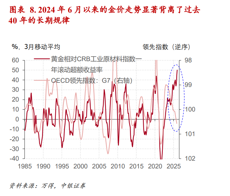 2025年反常偏高的黄金价格也与美元全球大循环的转折有关。通常情况下,黄金是一种带有避险属性的特殊的大宗商品,金价有明显的逆周期性:全球经济景气向好的时候,金价涨幅会跑输大宗工业原材料的价格;全球经济景气走弱的时候,金价反而会跑赢工业原材料价格。在过去40年时间里,金价的这种逆周期性相当显著。但情况从2024年6月开始发生了变化。从那至今的这一年多时间里,以7大工业国OECD领先指数衡量的国际经济景气度明显上升,反映国际经济景气整体向好。如果按照之前40年的经验,这时金价应跑输工业原材料价格才对。但情况恰恰相反,这段时间金价相对工业原材料价格的超涨幅度不降反增,甚至创下了40年来的新高,完全打破了过去40年的历史经验。