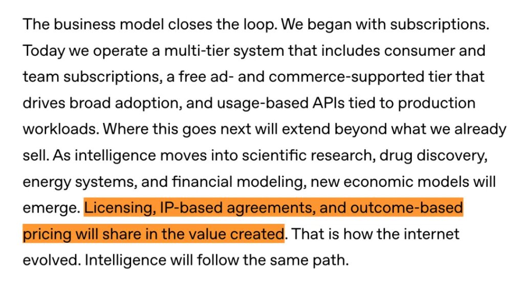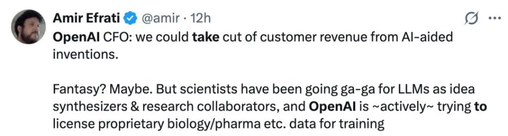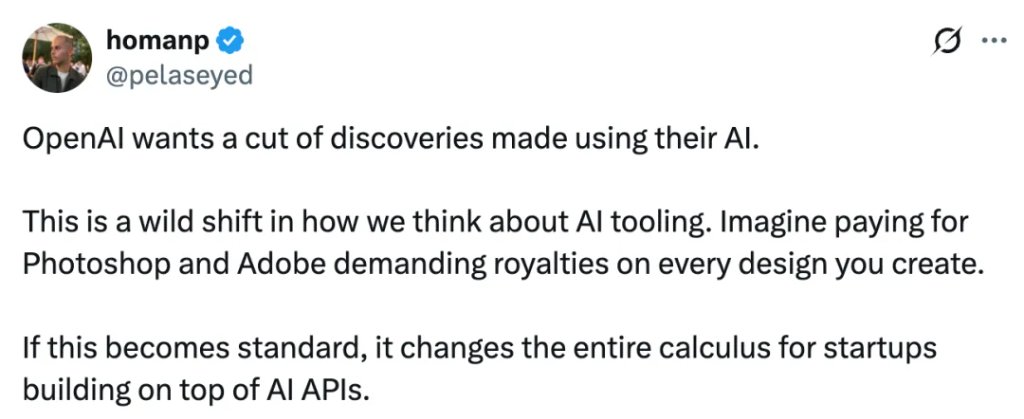 这意味着,OpenAI 可能正在考虑从「卖工具」转向「分利润」的商业模式。OpenAI 似乎不满足于只收「软件使用费」,而是想在客户发财时「抽成」。