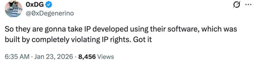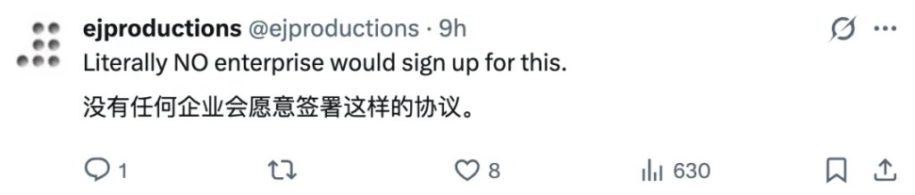 有人认为,这可能是对 AI 工具化认知的一次巨大颠覆。想象一下,如果你在使用 Photoshop,而 Adobe 却要求对你创作的每一件设计作品抽成。