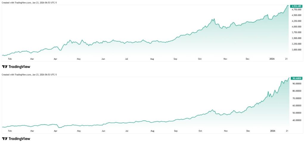 作者青睐的几种大宗商品近几个月来价格持续攀升,屡创新高。黄金价格在过去12个月里上涨了78.70%,达到每盎司4923美元;白银价格在同一时期内飙升了225%,接近每盎司99美元。