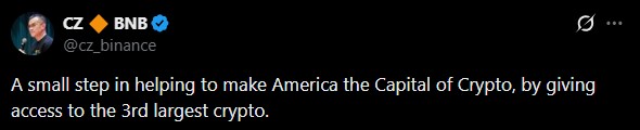 币安前首席执行官赵长鹏 (CZ) 将此发展描述为加密货币领域的积极一步,并表示受监管的准入有助于将美国定位为全球加密货币中心。