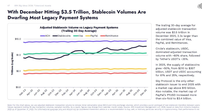 ARK Invest 2026 Big Ideas 数据显示:2025 年 12 月,调整后的稳定币交易量的 30 天移动平均值为 3.5 万亿美元,是 Visa、PayPal 和汇款业务总和的 2.3 倍。