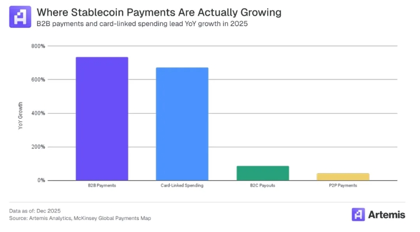据 Artemis Analytics 分析结果显示:2025 年稳定币支付的实际规模约为 3900 亿美元,较 2024 年实现翻倍增长。