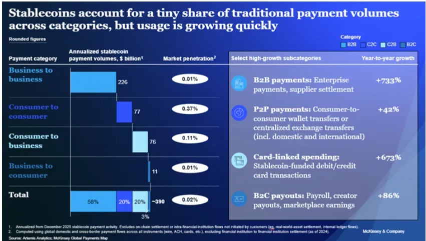 按目前的交易速度计算(年化数字基于 2025 年 12 月的稳定币支付活动),每年实际的稳定币支付量约为 3900 亿美元,约占全球支付总量的 0.02%。