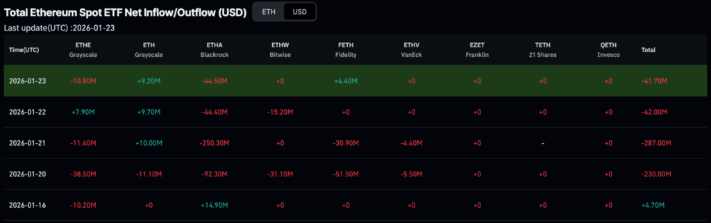 单日最大资金流出发生在1月21日,ETHA当日资金流出约2.503亿美元。随后,1月20日、22日和23日分别进一步下跌9230万美元、4440万美元和4450万美元,仅被1月16日1490万美元的资金流入略微抵消。