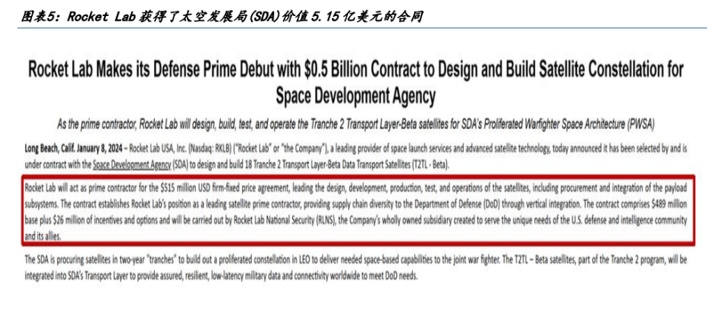 系统端(增长引擎): 凭借发射建立的信任,切入卫星制造和零部件供应。2024 年 1 月获得美国太空发展局(SDA)价值 5.15 亿美元的合同就是这一战略的里程碑,标志着公司正式获得美国国防部“主承包商”的官方认证。
