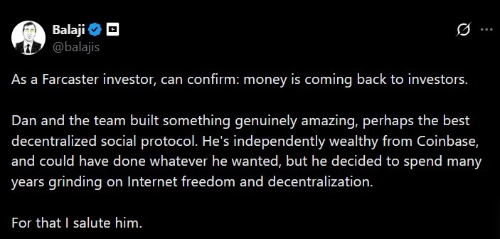 Farcaster投资人Balaji Srinivasan对此帖作出了回应,确认投资者资金已被返还。他同时对团队在去中心化社交基础设施领域的工作表示赞赏。