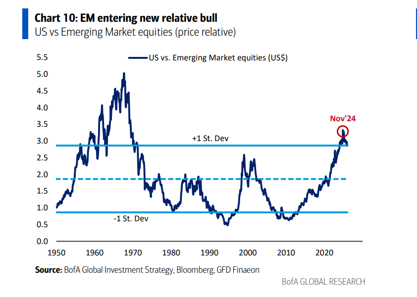 新兴市场牛市: 国际股票的长期牛市进入第二年。由大宗商品价格强势(受AI建设推动)带来的新兴市场货币走强,将压低新兴市场债券收益率,从而推动新兴市场股票进入新的相对牛市。美银特别看好中国,认为其在MSCI ACWI指数中3%的权重相对于美国64%的权重过低,且消费占GDP比重有望从40%的低位回升。