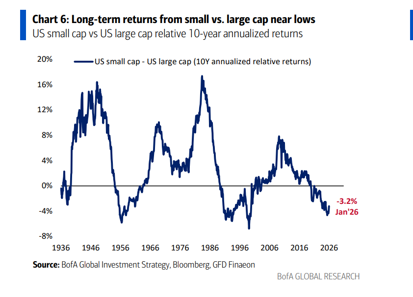仓位极度分化: 2020年代至今,美国大盘股获得了1.6万亿美元的资金流入,而小盘股却遭遇了61亿美元的资金流出。这种巨大的剪刀差意味着极端的反向交易机会。