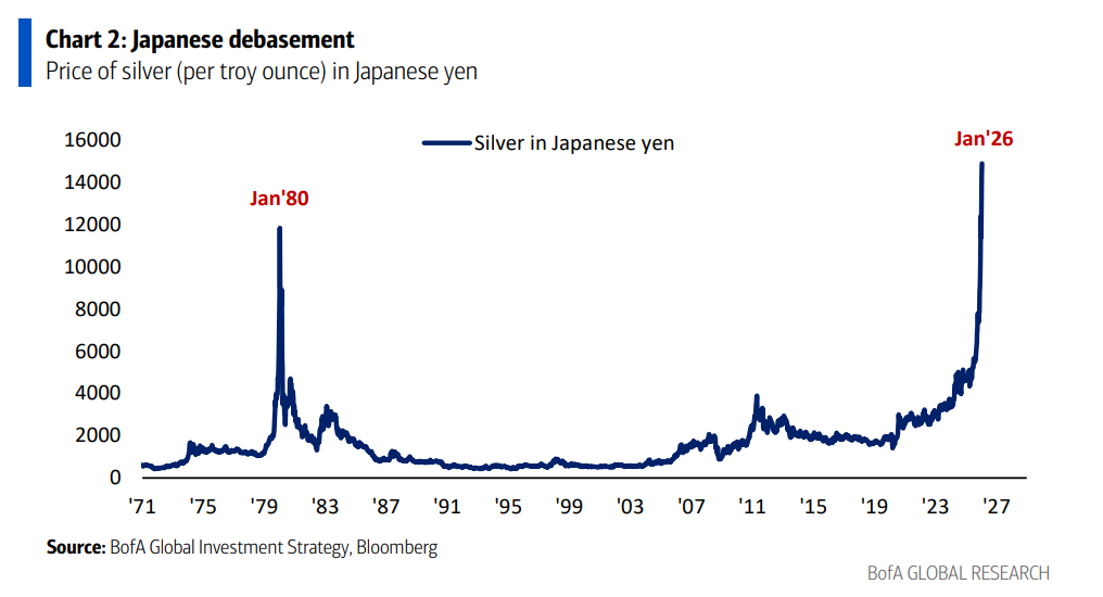 日元计价白银: 价格创下历史新高,超过了1980年的高点,标志着货币贬值的影响。