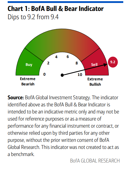牛熊指标目前读数为9.2,处于“极度看涨”区间(大于8.0即为卖出信号)。这主要受股市和新兴市场ETF的大额流出影响,抵消了现金水平处于历史低位(3.2%)的利好。这提示短期市场情绪过热,需警惕回调风险,但这更多是轮动的机会而非彻底离场的信号。