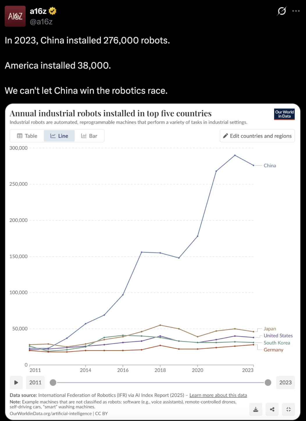 机器人领域尚未获得应有的关注。当前舆论焦点仍集中在软件与纯 AI 叙事,而物理自动化则在默默积累势能。