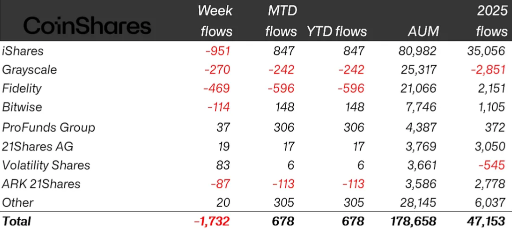 加密货币基金出现17亿美元资金流出,为2025年11月以来最大规模