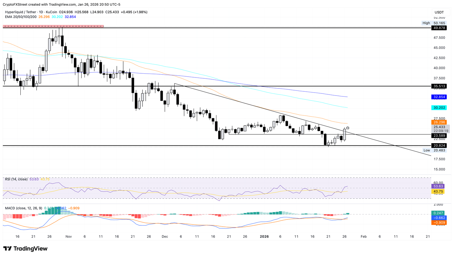 截至周二发稿时,Hyperliquid 上涨 2%,延续了前一日 12% 的涨幅。HYPE 代币的反弹价格接近 26.29 美元的 50 日指数移动平均线 (EMA),但仍低于 100 日和 200 日 EMA,预示着看跌趋势。