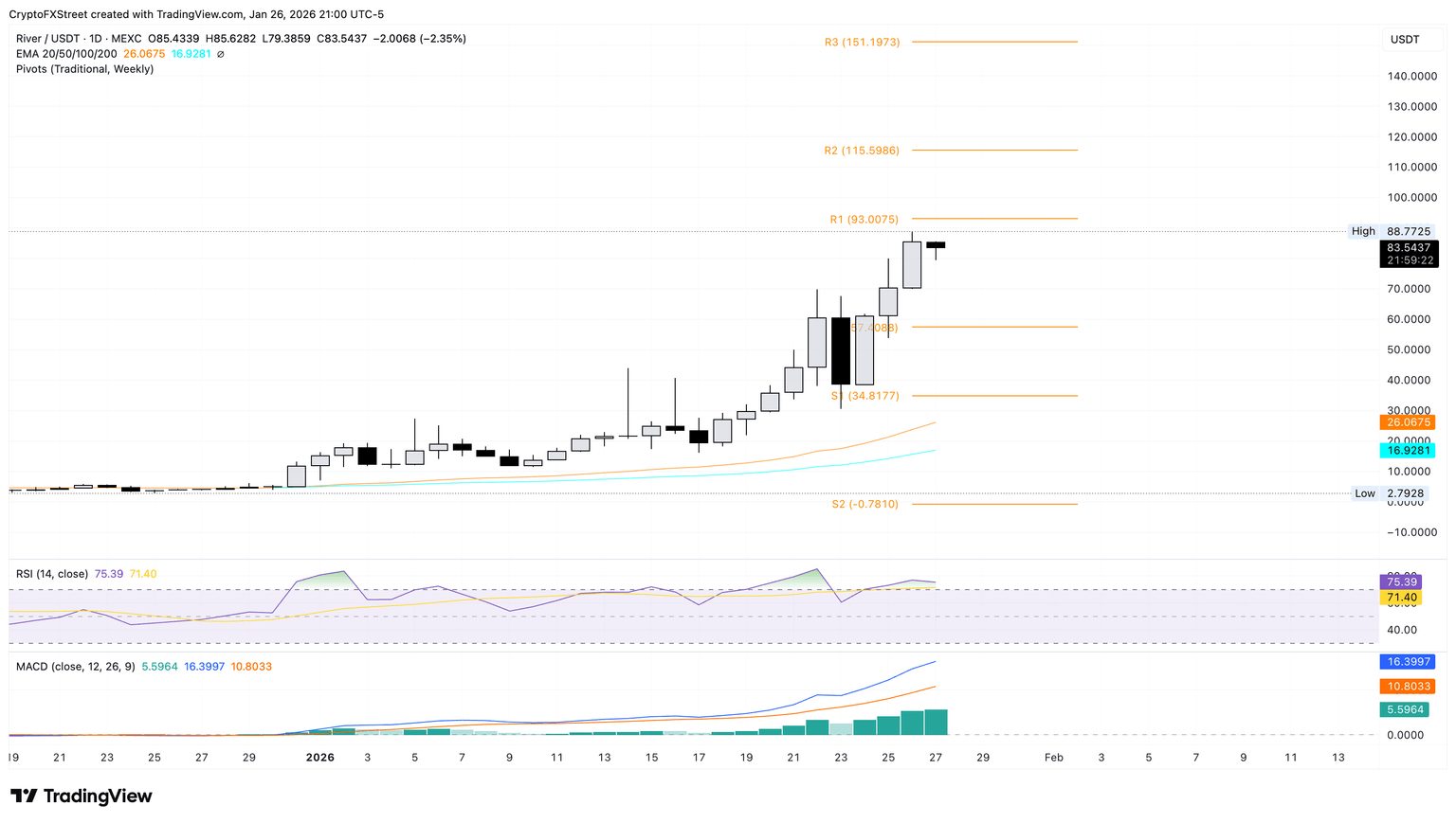 RIVER 的直接阻力位在 93 美元的 R1 枢轴点,其次是 115 美元的 R2 枢轴点。