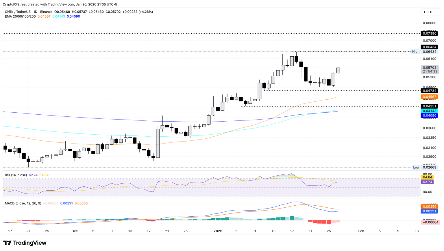 CHZ 的反弹可能会测试 1 月 17 日的 0.064 美元高点,如果能果断收于该高点之上,则将打开通往 12 月 20 日低点 0.073 美元水平的大门。