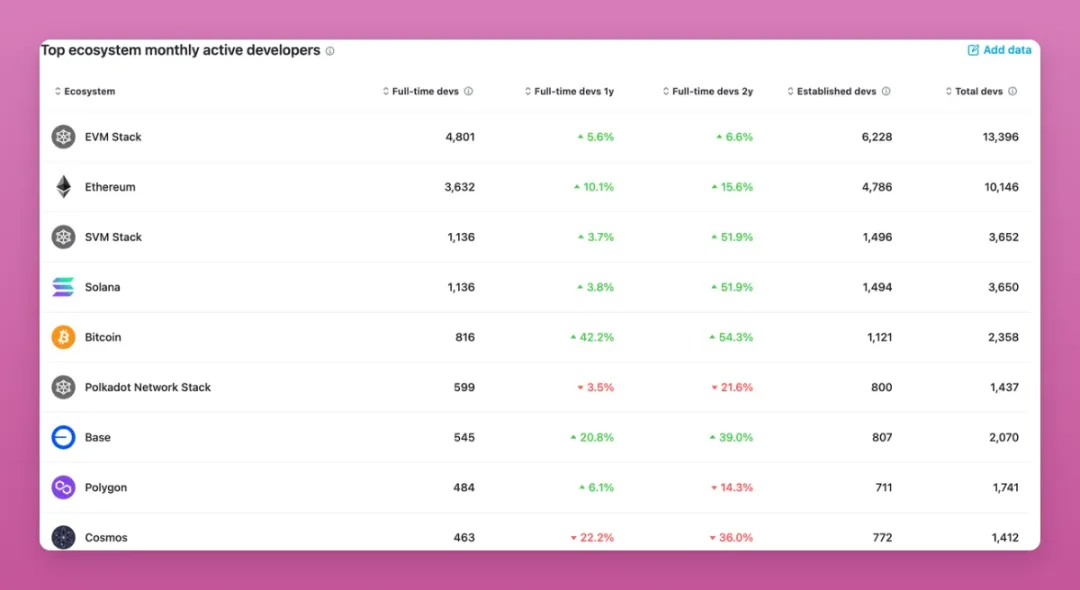 此次开发者数量下滑,主要是兼职开发者和新入门开发者离场所致。2024-2025 年的市场周期中,大批开发者涌入行业,试图通过空投和代币激励快速获利,而当这些红利消失,他们便选择离开。