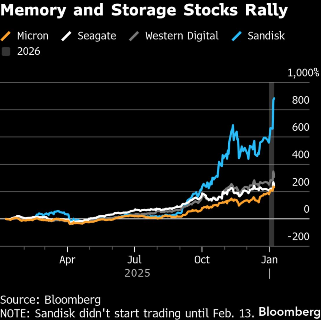 闪迪上涨 577%,成为标普 500 年度涨幅最大的股票;西部数据上涨 281%,美光上涨 236%,希捷上涨 216%。