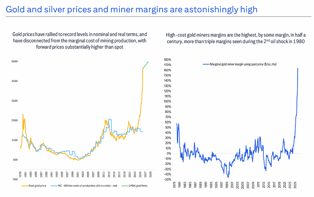 在最新发布的年度商品展望报告中,花旗大宗商品研究团队把焦点放在两个矛盾点上:一边是贵金属价格与矿山成本“脱钩”、利润率飙到几十年罕见;另一边是基本金属短期顺风仍在,但真正能讲中期故事的,集中在铜、铝以及它们背后的电力与AI叙事。