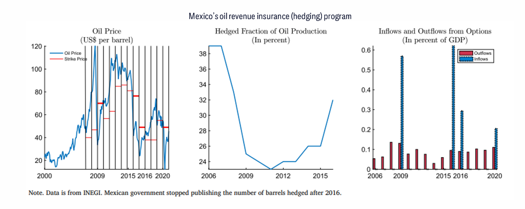 报告花了不少篇幅讲墨西哥的石油收入保险式对冲:通过滚动支付保险费来降低收入波动,而不是出售价格上行空间。引用的学术研究结论是:墨西哥过去20年没有出现重大对冲问题,同时获得了更低的收入波动;IMF与学界研究还提到,这带来了更低的主权债成本与福利增益。