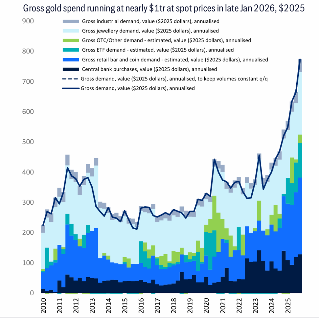 报告对金价的拆解很简单:金价≈买金的美元总支出 ÷ 黄金供给(矿产供给+存量抛售)。在1月下旬,按现货价格年化计算、并以2025年不变价口径折算,全球“买金总支出”接近1万亿美元。