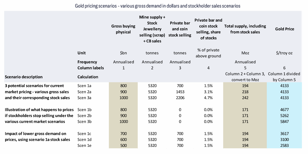 花旗还用情景表格把“同一价格可以由不同组合解释”讲透:在不同的买金总支出与不同的存量抛售比例组合下,可以推导出相同的金价水平;而一旦存量持有人停止抛售,在相同买金支出假设下,推导的金价会明显跳升(花旗给出的对应水平从约4677美元/盎司一直到约5847美元/盎司)。