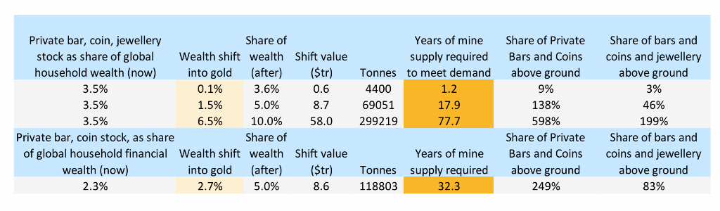 报告最激进也最有冲击力的一页,是用供给弹性来否定“财富平滑迁移”这种想象:当前黄金供给的价值量大约只相当于全球家庭财富的0.1%。这意味着家庭财富只要有0.1%(千分之一)的增量转向黄金,理论上就需要“矿产供给翻倍”才能满足。