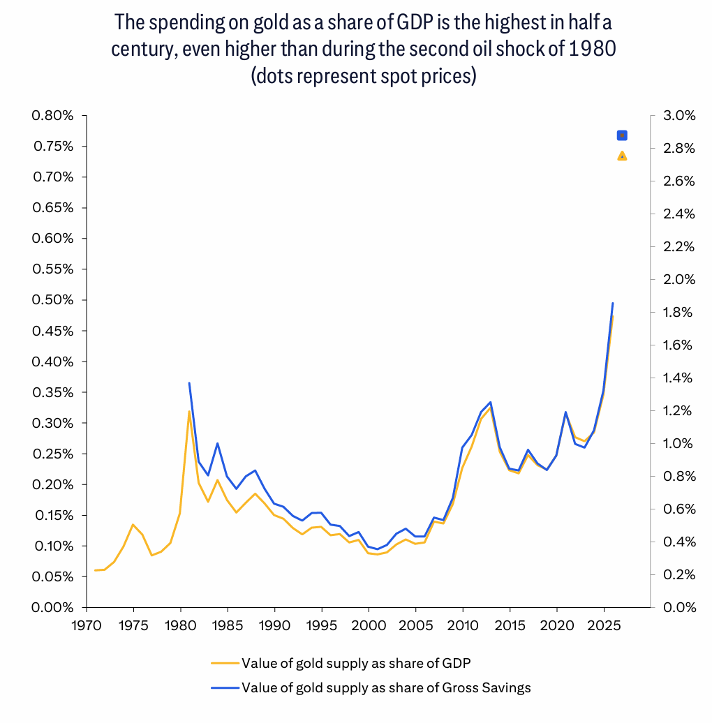 花旗给出一个更像“可持续性压力测试”的口径:在5100美元/盎司附近,全球黄金支出约占GDP的0.73%,约占全球总储蓄的2.9%,是55年数据里最高水平之一。只看家庭端的珠宝与投资需求,净支出约占家庭储蓄的5–6%(报告假设家庭储蓄约9–10万亿美元);毛支出估算甚至到10–11%。花旗的结论很直接:这很高,长期不太可能可持续。