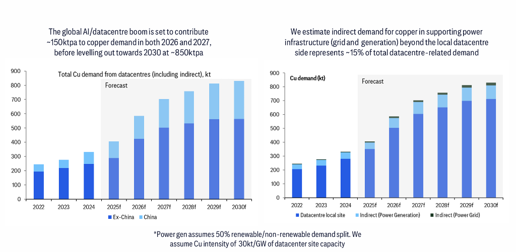 - AI数据中心建设若继续加速,可能在2026/2027分别带来约15万吨/年的铜需求增量;但数据中心目前只占全球铜消费1.5%,预计到2027也只是2.4%,因此这条线索在2027后边际会递减。