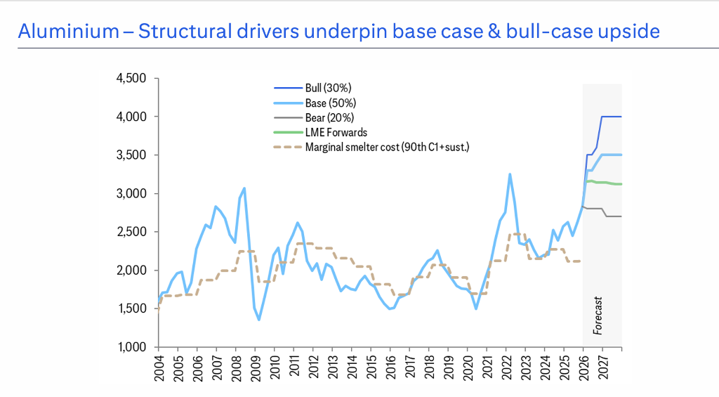 目标价方面,花旗给出2026年均价基准3650美元/吨、牛市4000美元/吨、熊市2800美元/吨。核心逻辑是,中期结构性看涨,供应受中国产能上限与电力约束(数据中心竞争电力),需求受益于能源转型与机器人产业增长;基准情景供需基本平衡,熊市需求疲软导致价格回落。
