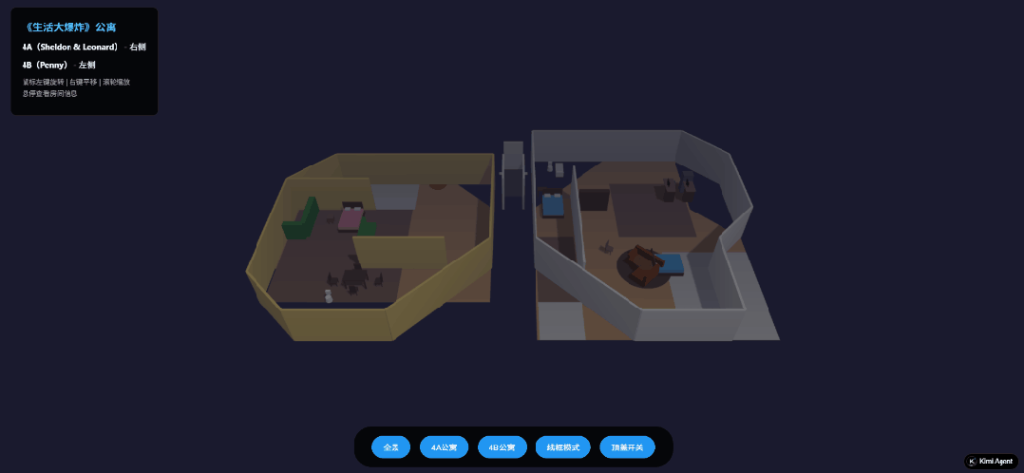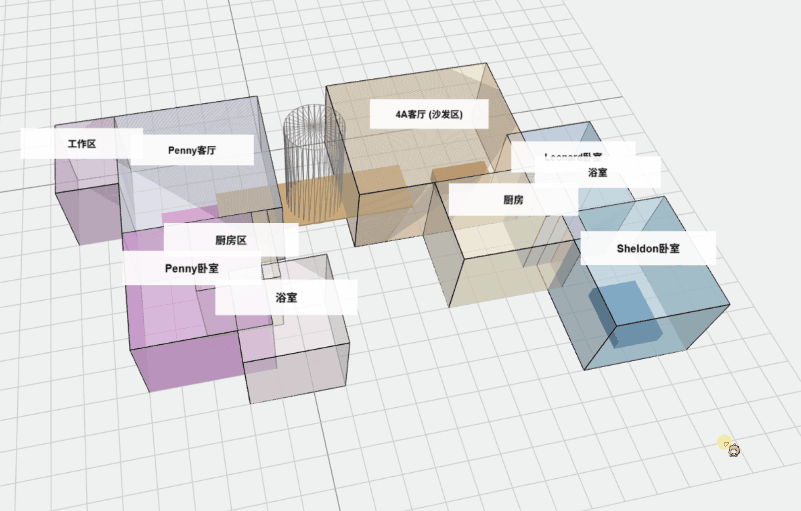 最终,得到的结果虽还算不上完美,但也没让我们失望,它不仅大体准确地还原了生活大爆炸的两个主要公寓的细节,还额外提供了线框模式与顶盖开源: