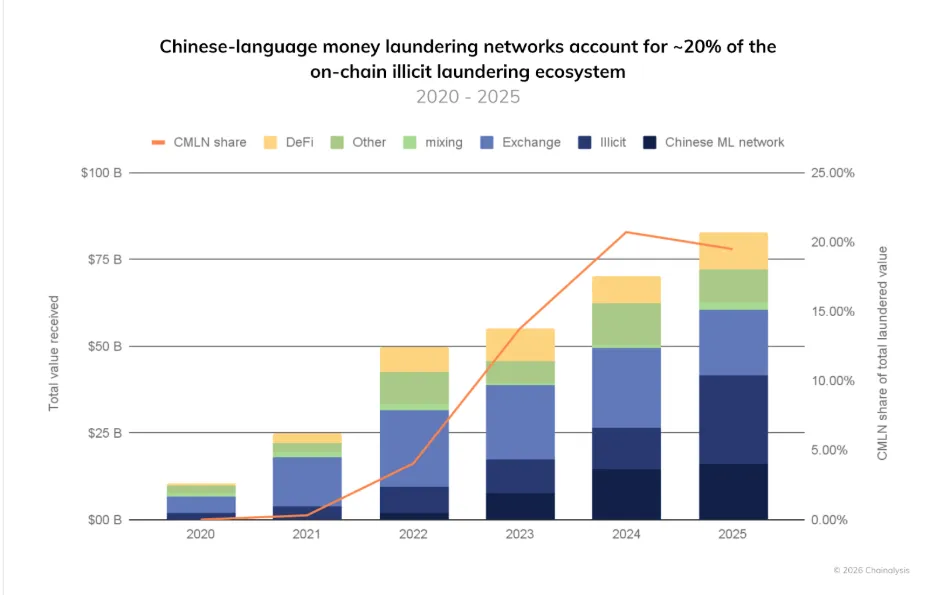 Chainalysis周二发布的一份报告显示,到2025年,非法加密货币洗钱金额将超过820亿美元,其中中国洗钱网络占161亿美元。这些网络的活跃钱包数量已从几年前的寥寥几个增长到2025年的近1800个,标志着一个功能齐全的地下生态系统的出现。