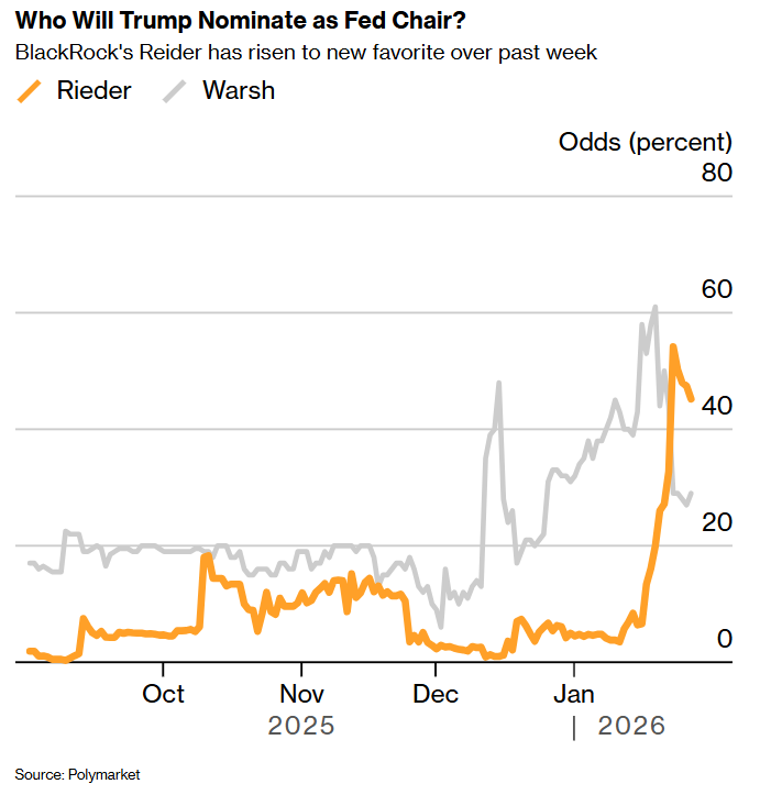 根据预测市场平台Polymarket的数据,投资者认为瑞德比之前的热门人选、前美联储理事凯文·沃什(Kevin Warsh)更为鸽派,沃什目前的当选几率是29%。而这位贝莱德高管的几率在本月早些时候他与美国总统特朗普的访谈引发积极反响后,已攀升至47%左右。